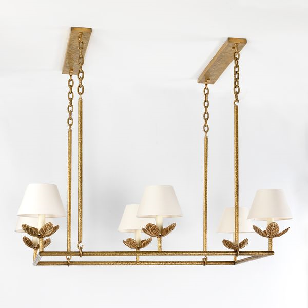 Based on a French antique, this is one of three Vaughan chandeliers featuring the distinctive sculpted leaves. Defined by the rectangular frame and simple chain, the hand-applied metalwork adds creative flair to this contemporary piece.