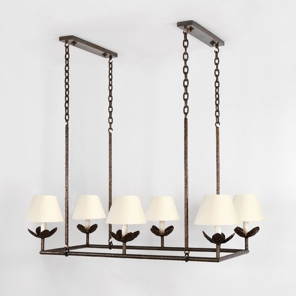 Based on a French antique, this is one of three Vaughan chandeliers featuring the distinctive sculpted leaves. Defined by the rectangular frame and simple chain, the hand-applied metalwork adds creative flair to this contemporary piece.