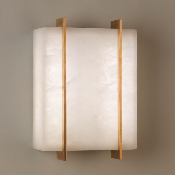 With a combination of hand-carved alabaster and cast brass detailing, this wall light is elegant and refined.Brass