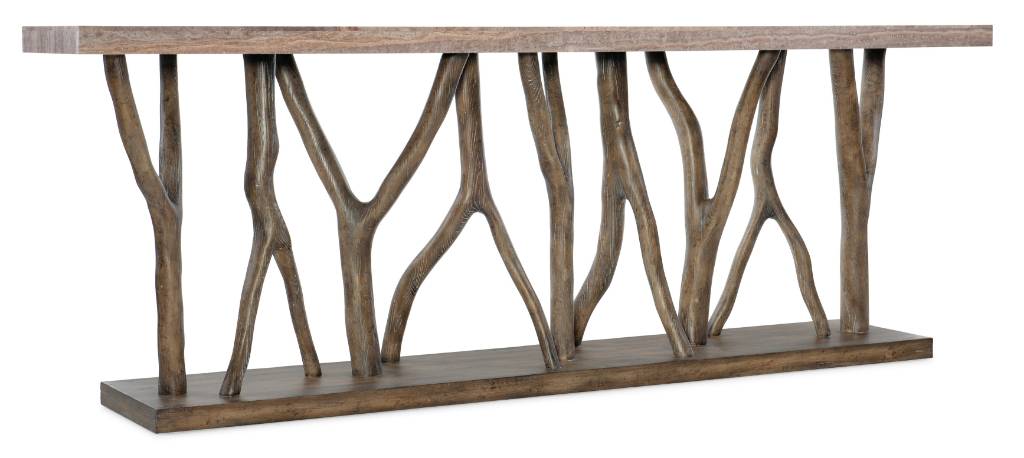 Product Description: An artistic accent of organic elegance, the Sundance Console Table has a stone veneer top and a tree branch motif base, with the base crafted of Pecan Veneers in a dark and earthy wood finish.