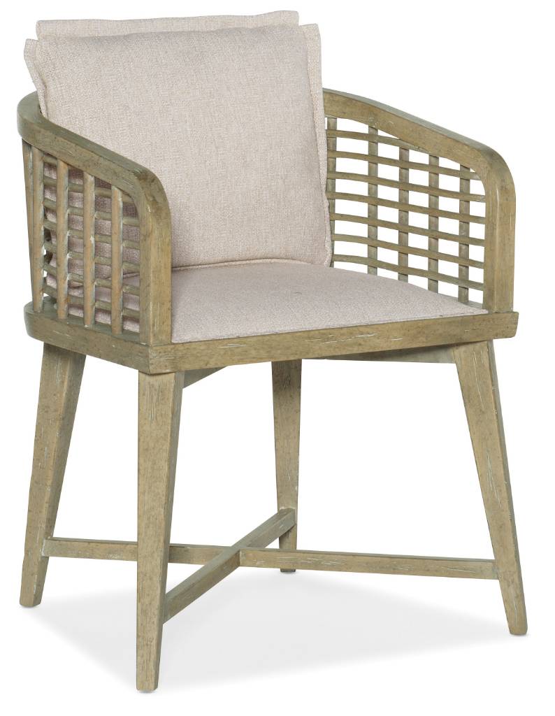 Product Description: Create a calming resort-inspired retreat in your home with the laid-back Sundance Barrel Back Chair. The appealing lattice design of the cane seat back combines with a loose back pillow and an upholstered seat covered in the Zuri Cream performance fabric to invite you to linger and relax. The legs, arms and X-style stretcher are finished in the light natural Driftwood finish with distressing including sandblasting and bleaching.