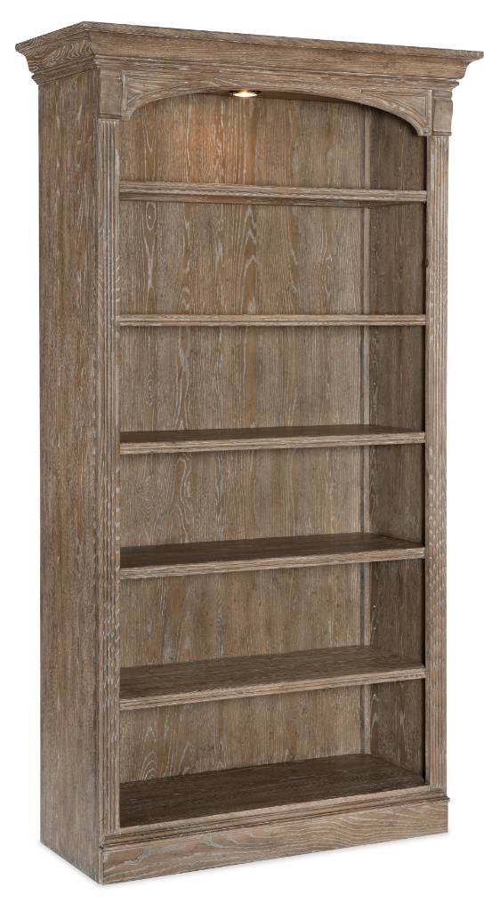 Product Description: Striking and stylish, the Sutter Bookcase makes your life easier by paving the way for a new (organized) day with essentials and collectibles at your fingertips. Crafted of Cathedral Oak Veneers, the Sutter Bookcase is finished in Claro, a distressed medium clear color. There are 3 adjustable wood shelves, one wood-framed glass shelf, one fixed wood shelf and a puck light in the top controlled by a touch switch on the right pilaster.
