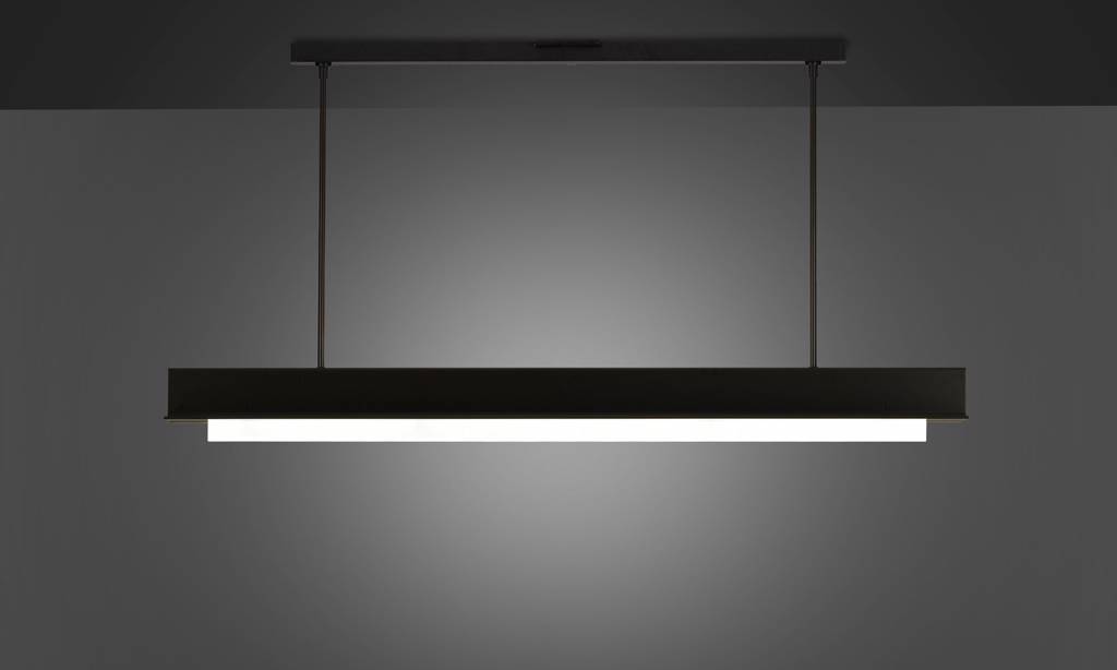 The linear T-Light features parallel pieces of extruded aluminum that hang from two stems and sandwich a ¾†thick piece of etched, water-white glass and form an upside down “Tâ€. Two strips of 3000ËšK LEDs provide warm up and down-light and are wired as dual circuits, which allows each light source to be dimmed separately. Once hung, each of the two stems can be adjusted independently to level the pendant.