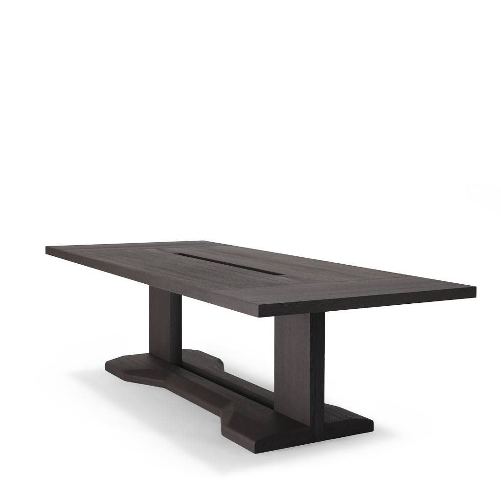 Designed for a project in Japan, the table was made in exceptional dimensions. This table is a strong and sculptural piece, a clear inspiration from a Japanese pagoda. The central slot of the table makes it unique.