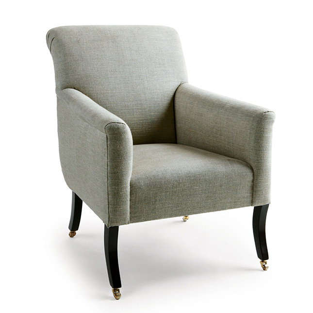 Description : Upholstered armchair with scrolled back and arms and tight seat. Brass casters. Material : Mahogany Legs Finish : 12 Dark Mahogany Fabric Shown : JW 1605 Kinsale - Green COM : 7 Yds COL : 126 Sq Ft