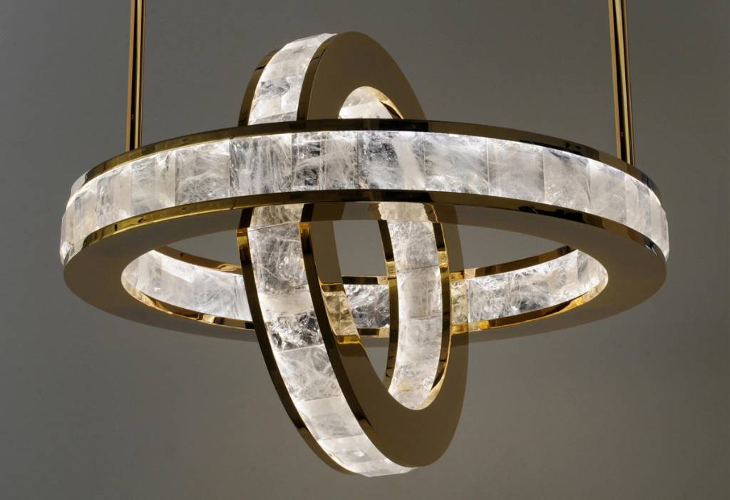 The Elysee H Chandelier is an exquisite light sculpture that consists of two discs embedded with rock crystals all around. The rotating inner disc provides a sense of dynamic movement when angled in different positions, as crystals appear and disappear, changing the luminosity and shape of light. When horizontally aligned, the discs evoke the flawless flow of Saturn’s rings.
