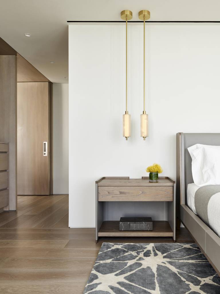 Theo’s Pendant, named for artist Stefan Gulassa’s son, is a stacked glass design inspired by the locking weights he spotted while traveling Italy as a 19-year-old. Light gently travels through the thickness of the water-jet-cut glass, whose surface has tiny rivulets of texture that give faces of the glass a frosted look, celebrating the process in which it is made.