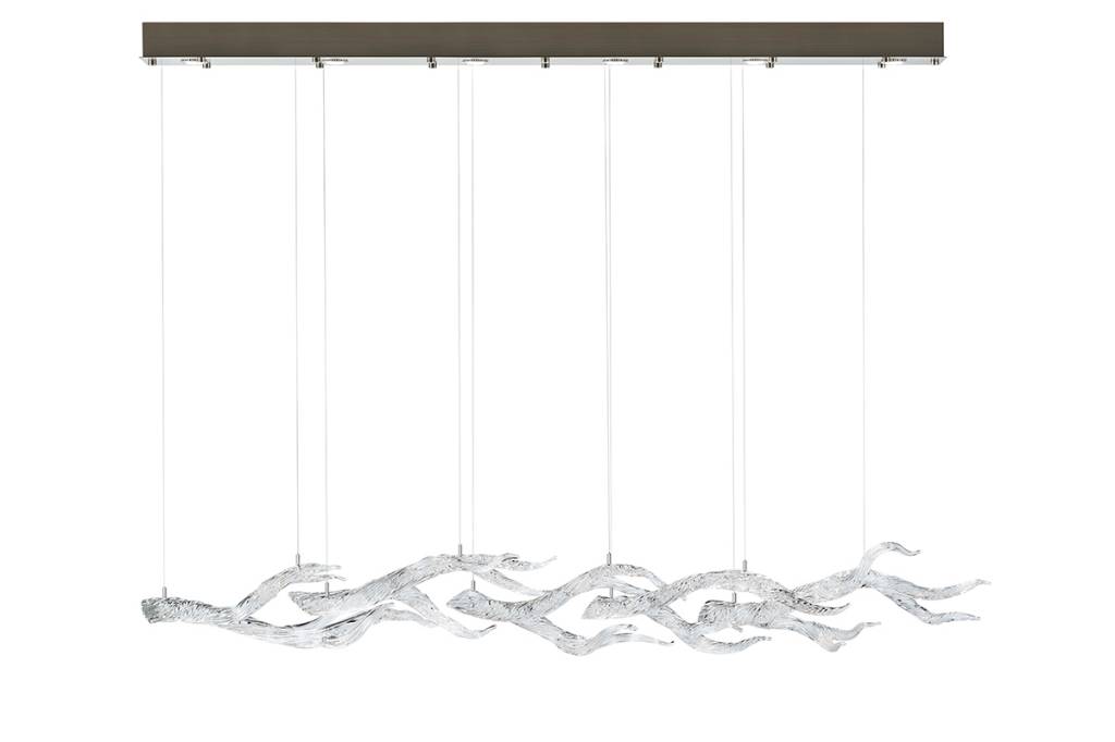 Custom configurations available,W: 60”,D: 10-12”,H: 12-15”,OVERALL H: Cable suspension to canopy, Height adjustable.,CANOPY W: 60”,CANOPY D: 10”,CANOPY H: 3”,STANDARD GLASS COLORS:,Clear,PRECIOUS LEAF OPTIONS:,24K Gold, Moon Gold.,METAL FINISH OPTIONS:,Polished Stainless, Brushed Stainless, Brushed Brass, Antique Brass, Dark Bronze,ILLUMINATION:,6 x LED MR16, GU10 base, 110v, 7.5w, 2700K, Dimmable. Recessed in canopy.