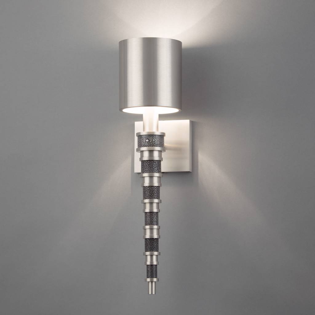 This customizable sconce is available in six metal finish options, with hubs available in one of five shagreen color options or one of three wood finish options.