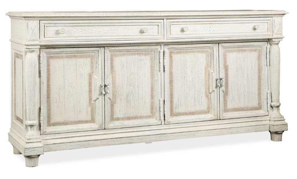 Product Description: Inspired by 19th Century furnishings of the Tuscany region, the Traditions Buffet exudes classic design details such as a stepped molded base and pilaster moldings on the front. The light-and-airy soft white Magnolia finish with creamy white round teardrop pulls creates a look of timeless chic. Crafted of Pine, Oak and Maple Veneers, the buffet has 4 doors with one adjustable shelf behind each. Two drawers, with the left drawer featuring a black felt liner and the right drawer with a removable black felt silverware tray. Ventilated back panel.