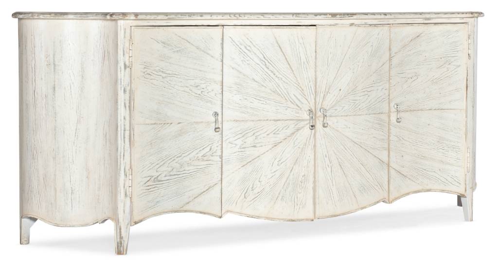 Product Description: Inspired by a mid-18th Century two-door cabinet found in France, the Traditions Entertainment Console is finished in the vintage chic soft white Magnolia finish. Crafted of Pine and Oak Veneers with Maple Inlay and a starburst veneer pattern front, the console has 4 doors, with one adjustable shelf behind each left and right door. There’s one adjustable shelf behind the pair of center doors, a ventilated back panel and an FC705 3-plug outlet.