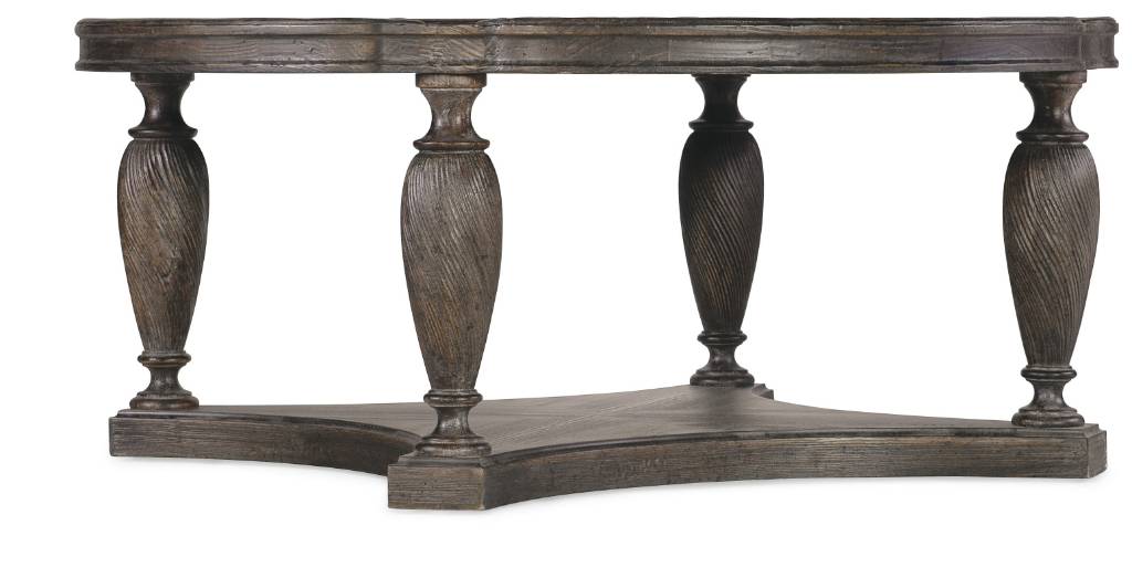 Product Description: Inspired by antiques and architecture of vintage character, the round Traditions Cocktail Table has a twist-leg design and exquisite scroll motif around the top edge. Crafted of Pine Veneers with a Solid-Wood Edge Top, the table is finished in Maduro, a rich brown with grey undertones and distressing for a casual appeal. The lower shelf provides a surface for handy storage or display.
