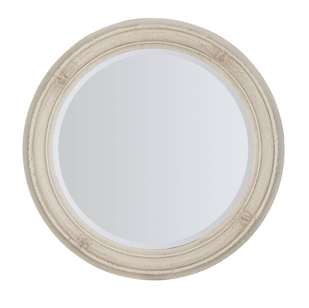 Product Description: Inspired by antiques and architecture of vintage character, the Traditions Mirror has beveled glass and a chic round shape. Crafted of Pine, the mirror is finished in Magnolia, a soft white finish with a sophisticated casual appeal.