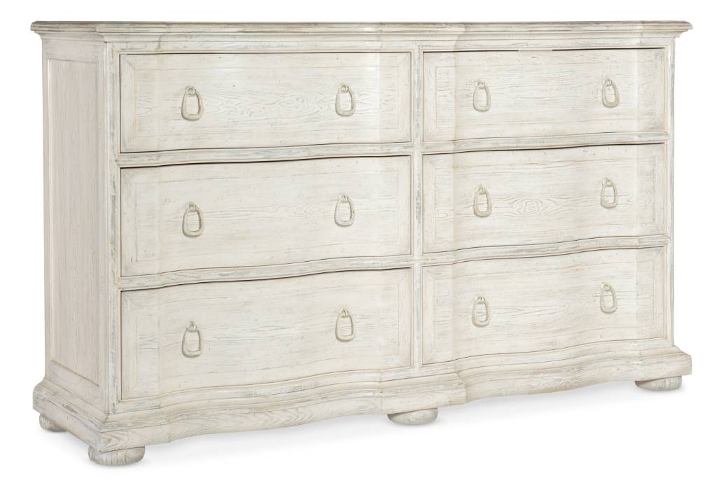 Product Description: Suggestive of furniture found in rural England in the 17th Century, the Traditions Six-Drawer Dresser has serpentine-shaped drawer fronts and aged pewter-finished ring pull hardware. Crafted of Pine Veneers, the dresser is finished in Magnolia, a soft white with distressing for a casual appeal. The top left drawer has a removable felt liner, and the top right drawer has a removable felt jewelry tray. Both bottom drawers are cedar-lined, and all drawers have soft-close drawer guides.