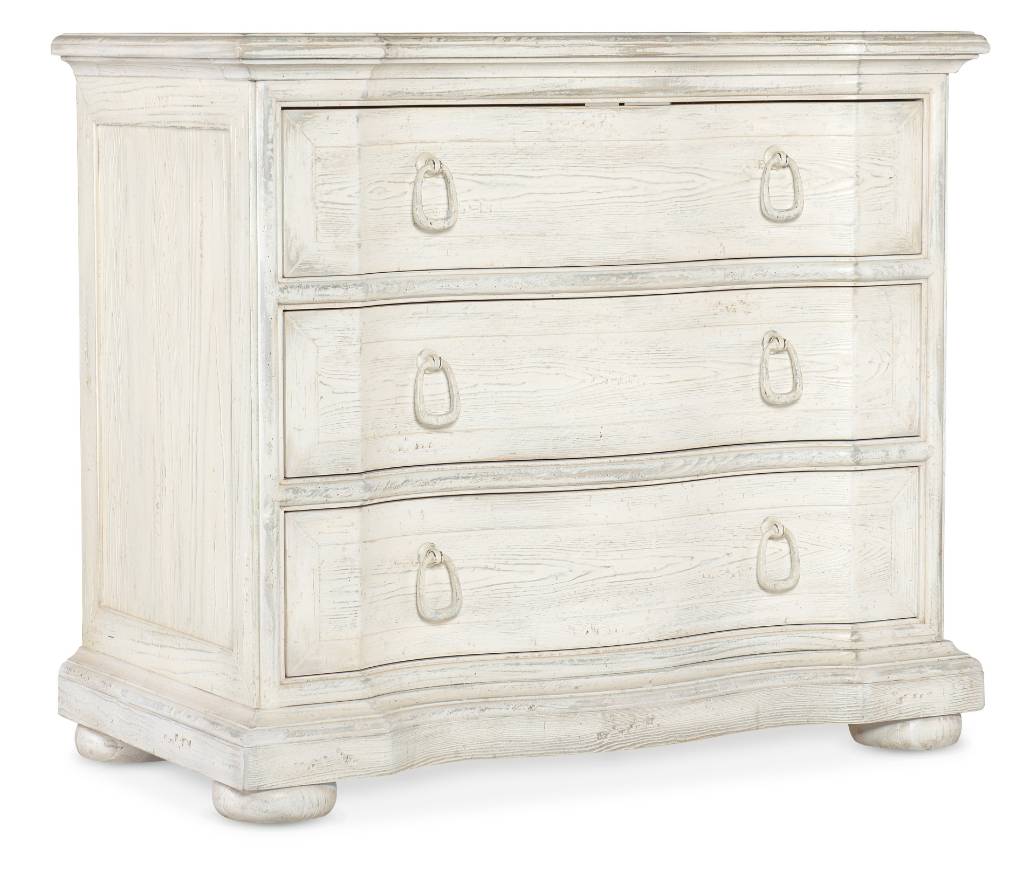 Product Description: With a chic character, classic silhouette and serene creamy white Magnolia finish, the Traditions Three-Drawer Nightstand sets an inviting tone for your bedroom retreat. Crafted of Pine Veneers with a Solid-Wood Edge top, the nightstand is loaded with function, featuring a top drawer with a removable black felt liner, a cedar-lined bottom drawer and an FC707 power bar with 3 electrical outlets and one live USB port. There’s a wire clip on the top center of the back panel and 2 touch switches on the left and right sides of the back panel.