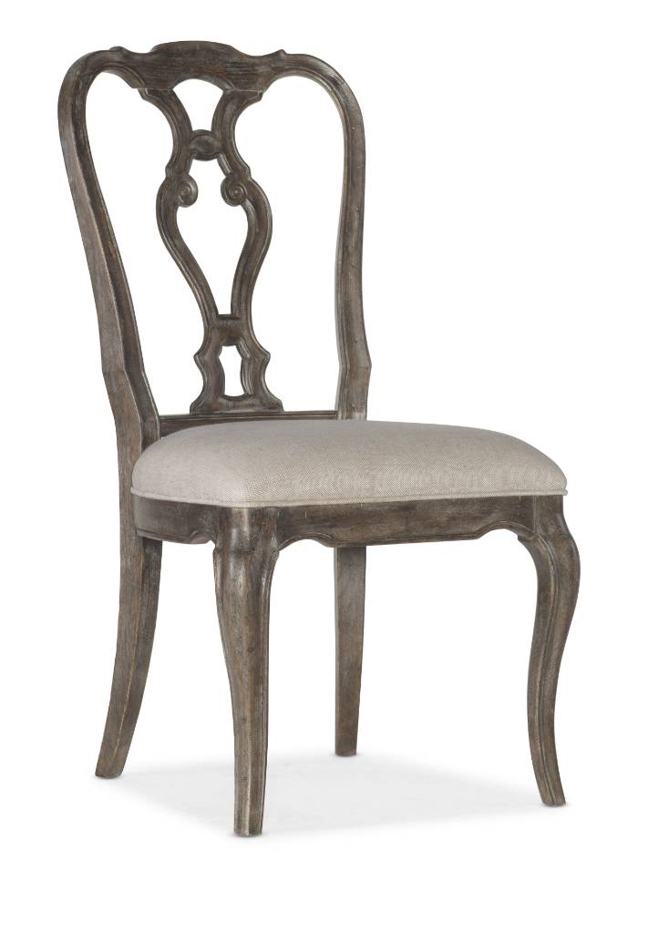 Product Description: Inspired by vintage antiques, the Traditions Wood Back Side Chair updates the classic carved splat-back silhouette and features cabriole legs and shaped arms for a timeless yet chic appeal. This elegant chair is finished in Maduro, an elegant yet casual brown with grey undertones, with a seat upholstered in a Linen performance fabric in a biscuit color.