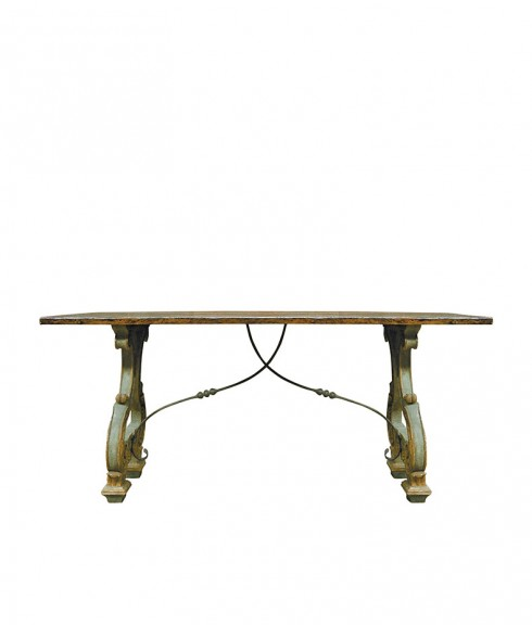 32”d x 76”w x 34”hlimited custom sizes available110 lbsantique walnut top with hand painted legs and antique iron fratinawalnut and hand forged iron