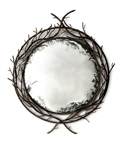 54”w x 59”hstandard size only80 lbspatinated ironhand forged twig iron with antiqued convex mirror
