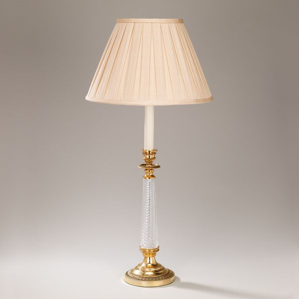 The intricate twisting pattern on the glass column pairs with the turned cast brass base and capital, creating a piece that emanates classic elegance.Glass (Brass)