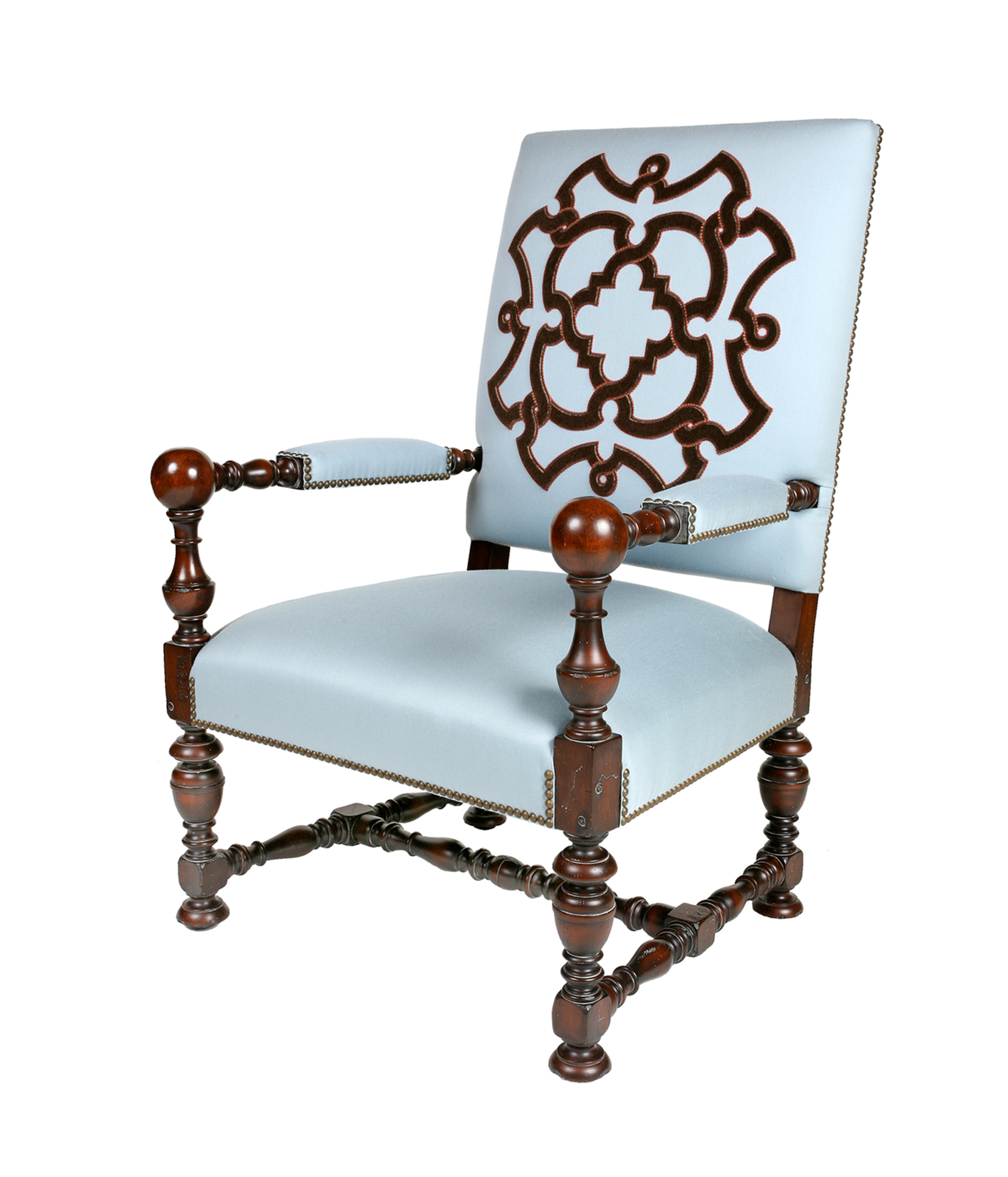 Reproduced faithfully from an 18th C. Spanish original, this beautiful chair features hand-turned hardwood arms and stretchers finished in an "antique" walnut finish. An armless dining version and ottoman are also available.