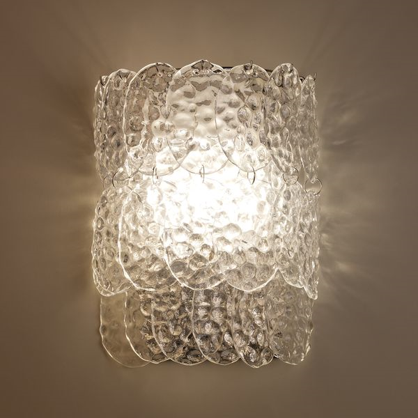 Based on a small chandelier we discovered in a London antique shop, the textured hand-pressed glass drops create a magnificent diffusion of light.Nickel