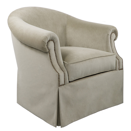 Standard upholstery with loose seat, drop skirt and nailhead detail. Available with swivel base