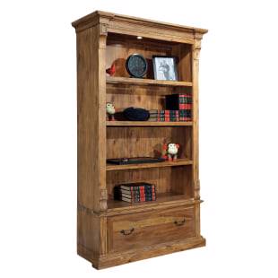 Acacia veneers and acacia solids.Illuminated bookcase.One adjustable wood-framed glass shelf.One adjustable wood shelf.Two fixed shelves.One file drawer on metal slides for letter or legal hanging files.Antique brass hardware.Floor levelers.Natural Wellington finish.Width 48" (122 cm)Depth 20" (51 cm)Height 84" (213 cm)