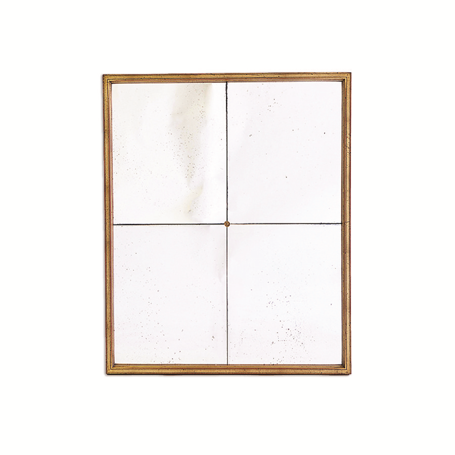 Description : Hand rolled panel mirror with center "rosette" and antiqued and distressed gold frame.