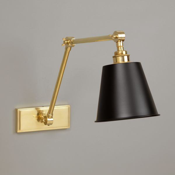 This library light is defined by its horizontal backplate, distinctive black painted shade and adjustable upturned arm allowing for a variety of lighting positions.Brass (Black Painted Shade)