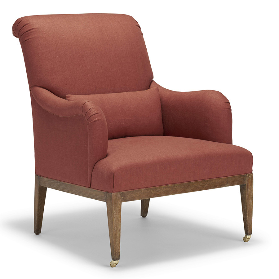 Upholstered armchair with gentle rolled arms, tight seat and back. Exposed wood rail and tapered legs are supported on brass casters.