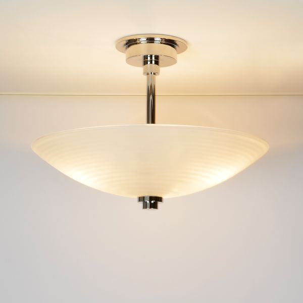 Inspired by Art Deco film house interiors, the crisp metalwork combines beautifully with the opaque frosted glass, finished with a rippled effect.