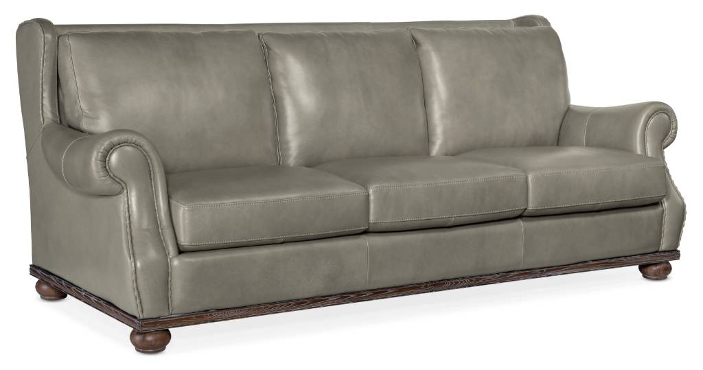 Product Description: Traditional with a youthful and stylish flair, the William Stationary Sofa has loose seat cushions, a modified wing back, chic bun feet and leather twist trim around the padded rolled arms and wing back. With dark wood feet, the sofa is covered in the semi-aniline top-grain leather Derrick Gray.