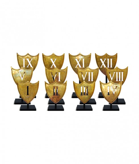 set of 12 small: 4’’ d x 5’’ w x 9’’ h medium: 4’’ d x 5’’ w x 10’’ h large: 4’’ d x 5’’ w x 11½’’ hincludes standstandard size only26 lbsantique brassbrass with iron stands